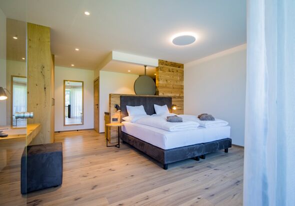 In unseren charmant eingerichteten Doppelzimmern herrschen Eichenholz und warmen Farbtönen vor. Die großen Boxspringbetten sorgen für einen angenehmen Schlafkomfort und das offene moderne Badezimmer sorgt für ein angenehmes Wohngefühl. Das absolute Highlight ist auch hier unsere Panorama-Infrarotkabine. Sommer wie Winter – hier können Sie nach einem sportlich anspruchsvollen Ausflug den Tag angenehm ausklingen lassen. Aufwachen und einschlafen bei atemberaubendem Blick auf die herrliche Bergkulisse inmitten der Natur.