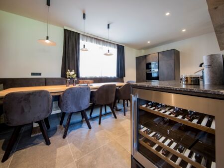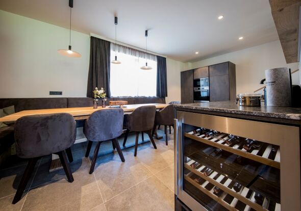 This wonderful retreat is completed by a fully equipped kitchen. Here you will find a coffee maker, dishwasher, cooker, oven, microwave and refrigerator with freezer compartment, as well as your own filled wine fridge. Refreshing mineralised water is provided by the BWT water dispenser.